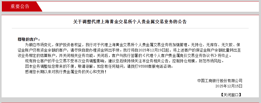 12月8日,建设银行也发布了《关于代理个人客户上海黄金交易所贵金属交易业务近期安排的公告》,自12月15日起将无持仓、无库存、无欠款、保证金账户仍有资金余额的客户保证金账户余额转出至业务签约账户,并自动关闭相关业务功能。